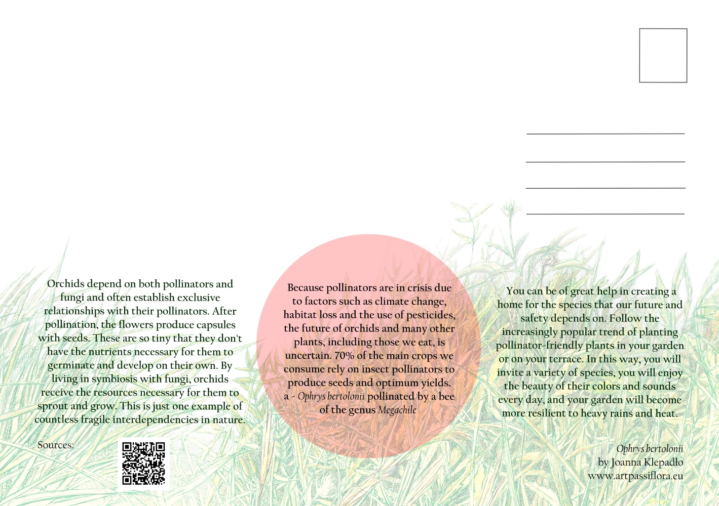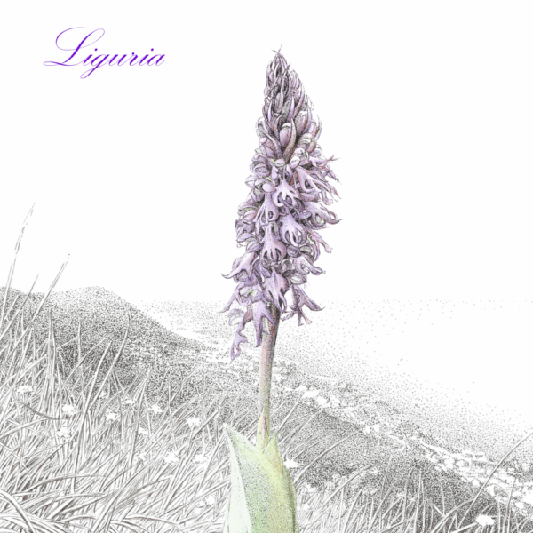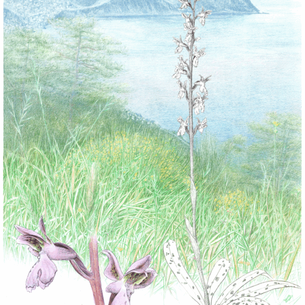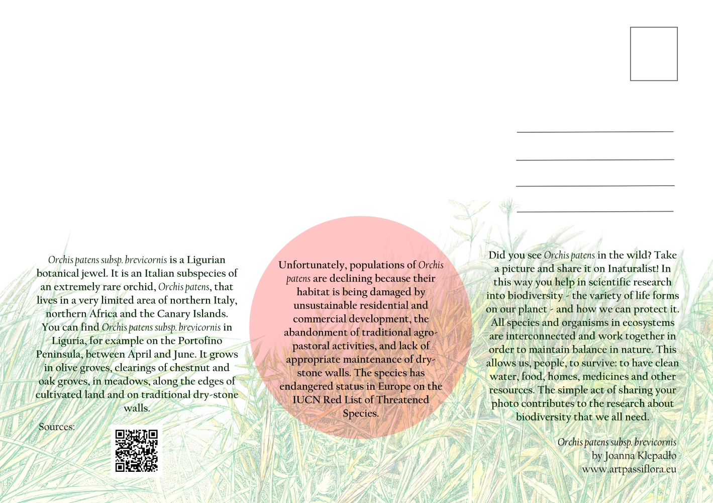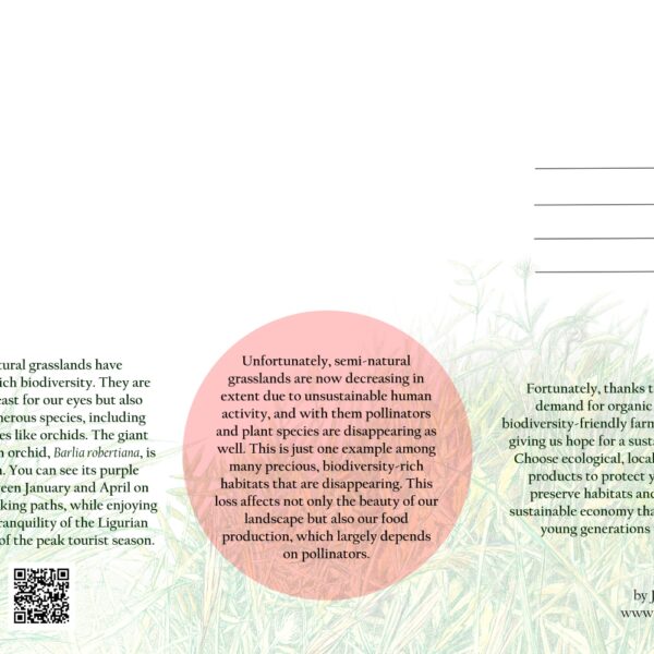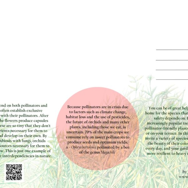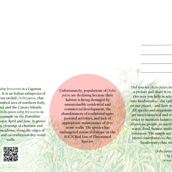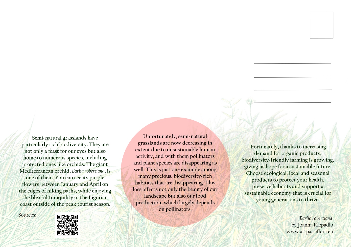 Postcards presenting Mediterranean orchids Ophrys bertolonii, Barlia robertiana and Orchis patens subsp. brevicornis. The aim of the series is to raise awareness about local biodiversity among tourists in Liguria, Italy.