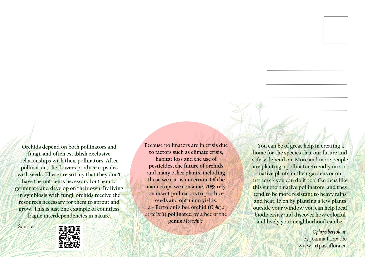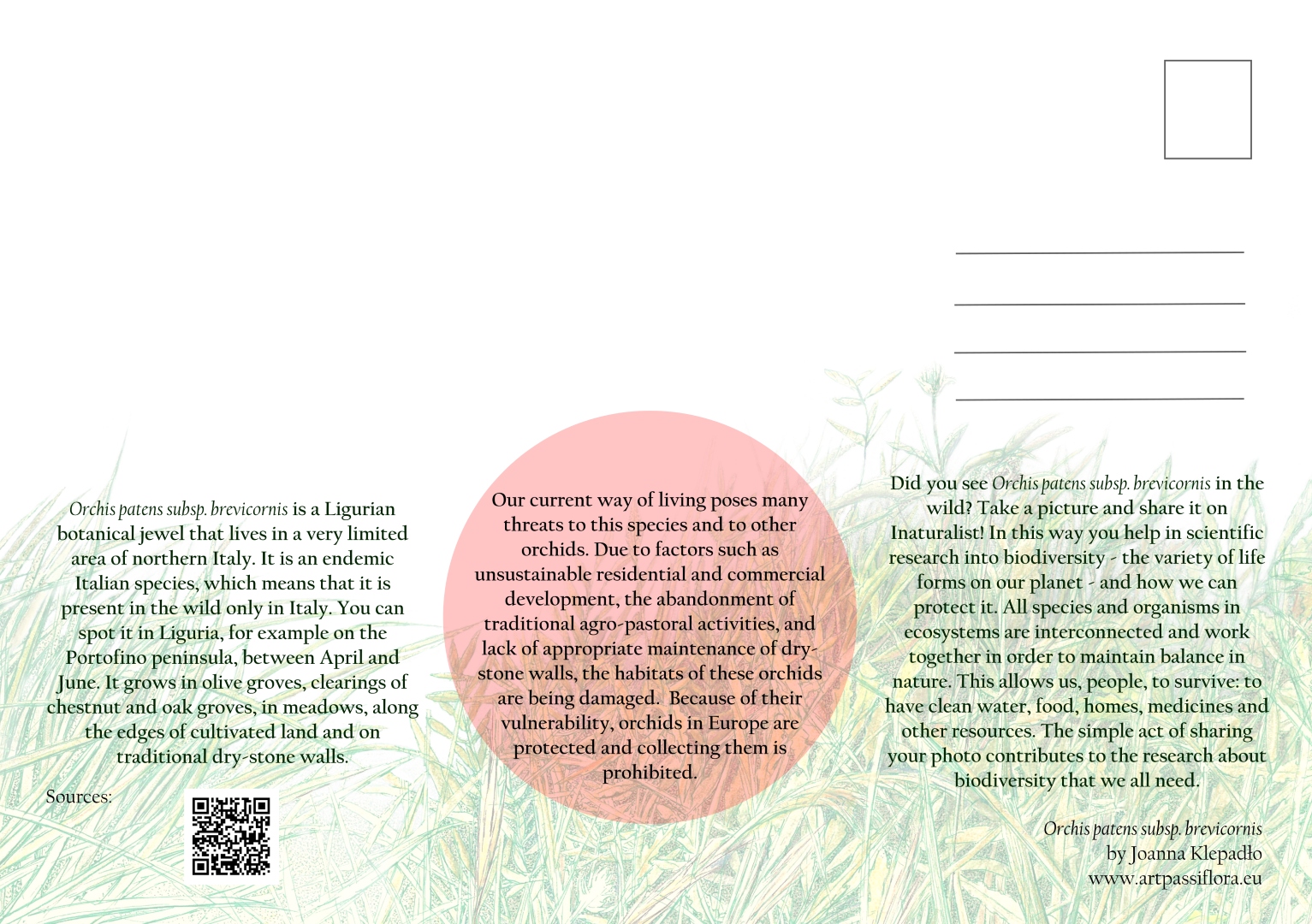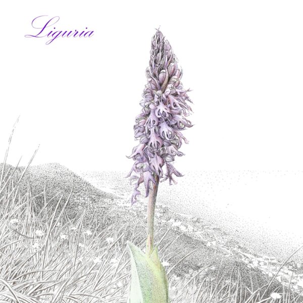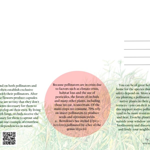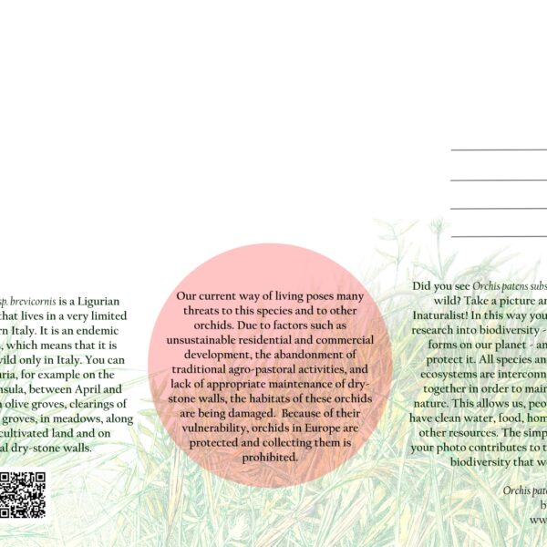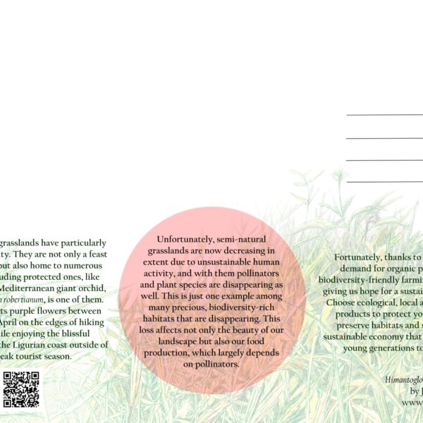 Postcards presenting Mediterranean orchids Ophrys bertolonii, Himantoglossum robertianum and Orchis patens subsp. brevicornis. The aim of the series is to raise awareness about local biodiversity among tourists in Liguria, Italy.